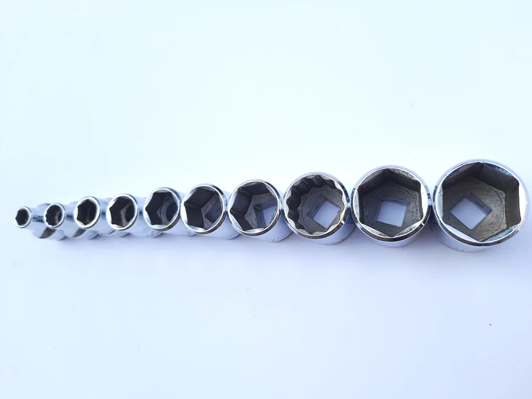سایز های 1/4 - 5/16 - 3/8 - 7/16 - 1/2 - 9/16 - 5/8 - 11/16 - 3/4 - 13/16معادل سایز های 8-9-10-11-13-14-16-17-19-20 میلیمتر.(درایو 3/8)
